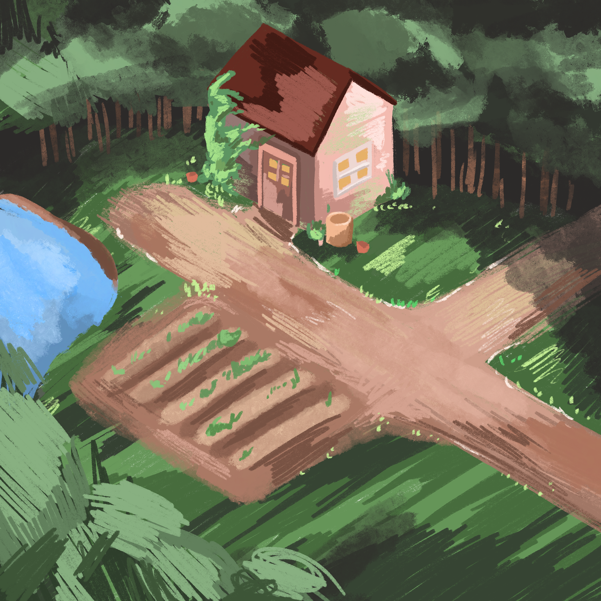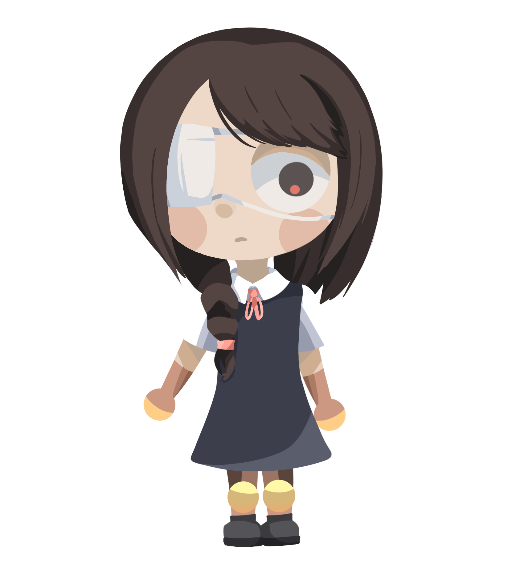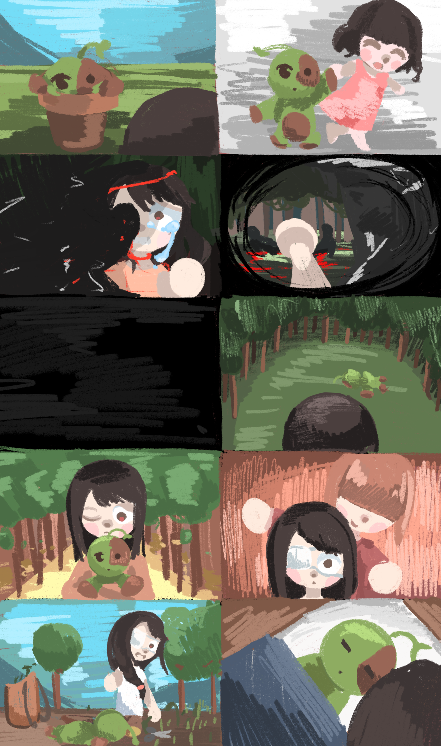 I created a new main character to fit with the darker theme of the story and gave them something to care about. The main character of this story is named Felt. She’s a forager that collects plants and herbs and sells them. The only friend she has is a magical doll named Stuffs. Stuffs is slowly losing the power to move and Felt goes on an adventure to save him.